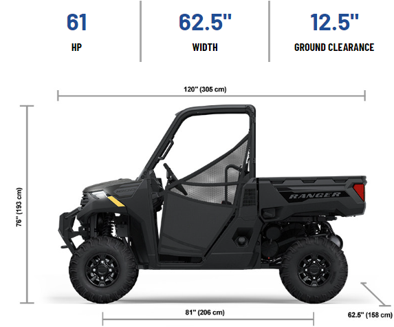| Overall Vehicle Size (L x W x H) | 120 x 62.5 x 76 in. (305 x 158 x 193 cm) |