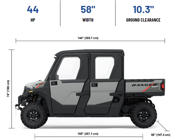 | Other Standard Features | Gas Assist Dump Box, Single Latch Tailgate, Rear-mounted Fiberglass Insulated Exhaust System, Standard In-dash SAE Charge Port, 575 CCA Battery, 660W Charging System (Stator), 48.4 Gal. Onboard Storage with Enclosed Dash Bins and Integrated Cell-phone Holder, Sealed Suspension Bushings and Wheel Bearings, Full Coverage Steel Front Bumper with Integrated Winch and Plow Mounts, Full Coverage Skid Plate, Premium Body Panels, Premium Cut & Sew Seats, Polaris Pulse Electrical System (3 position), Polaris HD 3,500 Lb. Synthetic Rope Winch with Autostop and In-Dash Switch, Premium Pro-Shield Cab, Doors with Crank Windows, Integrated Door Storage, Fixed Glass Windshield with Wiper and Washer Fluid, Rear Glass Panel, Factory Installed Heat with Defrost, Upper and Lower Dash Vents and Variable Fan Speed, USB Charging Port, Front Stabilizer Bar, Rear Wheel Liners,, NorthStar Badging |
