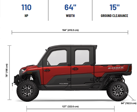 | Other Standard Features | Premium Contoured Seats with Additional Bolstering, Premium Headrests and Center Armrest. Premium, Telescoping Steering Wheel and Painted Interior Accents. Polaris Pulse Electrical System (6 position), Overhead Switch Panel, Roof Pulse Bar (x position), 140 Amp Charging System, Front Bumper, DC Outlet, USB Charge Port, Trickle Charger, 12V Located in the Cargo Box with In-Dash On/Off Switch, NFC Front Badge, NorthStar Badge. Polaris HD 6,500 Lb. Synthetic Rope Winch with Autostop and Wireless Remote. Power Windows (Front & Rear) |