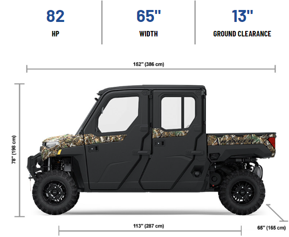 | Other Standard Features | Polaris HD 4,500 Lb. Synthetic Rope Winch with Autostop and Wireless Remote, Premium Pro-Shield Cab, Doors with Crank Windows, Fixed Glass Windshield with Wiper, Rear Glass Panel, Dome Light, Rearview Mirror, Heat, AC, Defrost, Premium Cut & Sew Seats with Contoured Seatbacks and Embroidered Polaris Branding, Premium Steering Wheel and Interior Accents, Polaris Pulse Electrical System with 6-Position Underhood Busbar and 6-Position Roof Busbar, Standard In- Dash SAE Charge Port, NFC Front Badge, NorthStar Badge |