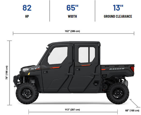 | Other Standard Features | Polaris HD 4,500 Lb. Synthetic Rope Winch with Autostop and Wireless Remote, Premium Pro-Shield Cab, Doors with Crank Windows, Fixed Glass Windshield with Wiper, Rear Glass Panel, Dome Light, Rearview Mirror, Heat, AC, Defrost, Premium Cut & Sew Seats with Contoured Seatbacks and Embroidered Polaris Branding, Premium Steering Wheel and Interior Accents, Polaris Pulse Electrical System with 6-Position Underhood Busbar and 6-Position Roof Busbar, Standard In- Dash SAE Charge Port, NFC Front Badge, NorthStar Badge |