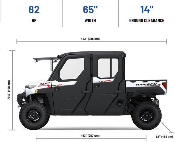 | Other Standard Features | Polaris HD 4,500 Lb. Synthetic Rope Winch with Autostop and Wireless Remote, Arched A-Arms, Nivomat Self-Leveling Suspension, Polaris Engine Braking System with Active Descent Control, Premium Pro- Shield Cab, Doors with Power Windows, Tip- Out Glass Windshield with Wiper, Rear Glass Panel, Dome Light, Rearview Mirror, Heat, AC, Defrost, Premium Cut & Sew Seats with Contoured Seatbacks and Embroidered Polaris Branding, Premium Steering Wheel and Interior Accents, Polaris Pulse Electrical System with 6- Position Underhood Busbar and 6-Position Roof Busbar, Standard In-Dash SAE Charge Port, In Dash Speakers, Front & Rear Cameras, 7" Glove Touch Display: Plow Mode, Group Ride, GPS Navigation, Bluetooth, AM/FM Radio ,Switched 15amp 12V Auxiliary Power outlet in Box, Switched Rear Facing LED Cargo/Work light, Added Accy Switch Panel (4 switch locations), Equipped with Connected, NFC Front Badge, NorthStar Badge, *Connectivity with Ride Command+. *Not available in International locations |