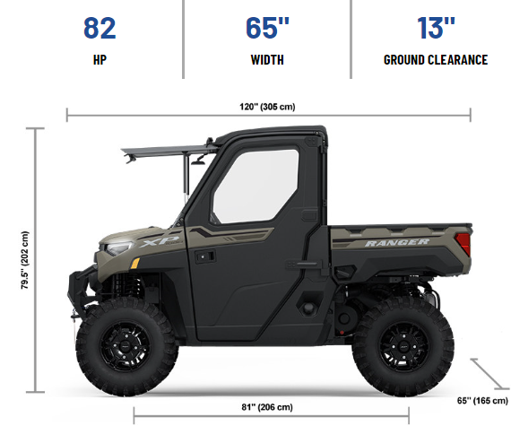 | Other Standard Features | Polaris HD 4,500 Lb. Synthetic Rope Winch with Autostop and Wireless Remote, Premium Pro-Shield Cab, Doors with Power Windows, Tip-Out Glass Windshield with Wiper, Rear Glass Panel, Dome Light, Rearview Mirror, Heat, AC, Defrost, Premium Cut & Sew Seats with Contoured Seatbacks and Embroidered Polaris Branding, Premium Steering Wheel and Interior Accents, Polaris Pulse Electrical System with 6-Position Underhood Busbar and 6-Position Roof Busbar, Standard In- Dash SAE Charge Port, In Dash Speakers, Front & Rear Cameras, 7" Glove Touch Display: Plow Mode, Group Ride, GPS Naivigation, Bluetooth, AM/FM Radio NFC Front Badge, NorthStar Badge, *Connectivity with Ride Command+. *Not available in International locations |