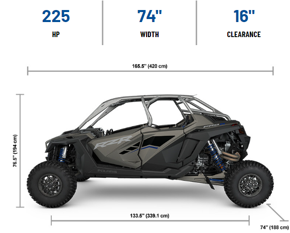 | Other Standard Features | RIDE COMMAND, High Output External 1700W Alternator, Polaris Pulse System, In-Dash Charge Port, 2 Front DC Accy Ports, Polaris P.A.S.S., Painted Aluminum Roof, Colored Toe Link, Hood Scoop, Mud and Rock Guards, User Selectable Throttle Modes (Sport, Rock, & Race), Front Bumper |