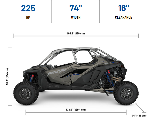Find specifications below for the 2024 Polaris RZR Pro R 4 Ultimate Matte Heavy Metal Side by Side. Specs include ground clearance, wheelbase, box capacity, cargo system, engine braking system, instrumentation, lighting, travel, horsepower, engine, seat type and suspension.