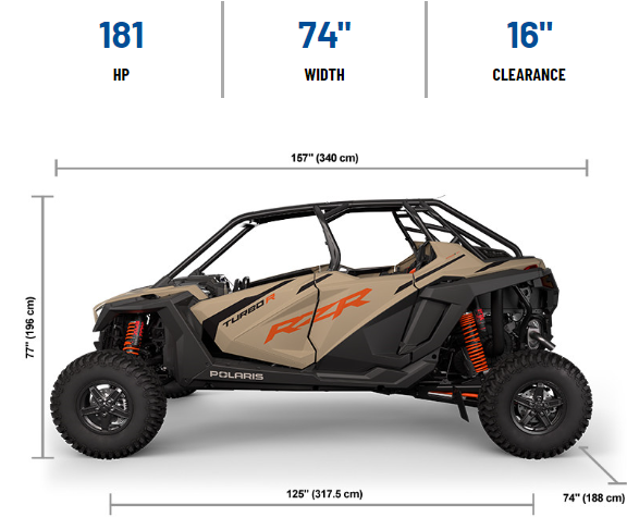 | Other Standard Features | RIDE COMMAND, High Output 900W Charging System, Polaris Pulse System, In- Dash Charge Port, 2 Front DC Accy Ports, Polaris P.A.S.S., Painted Aluminum Roof, Colored Toe Link, Mud and Rock Guards, Color Matched Seats, Front Bumper |