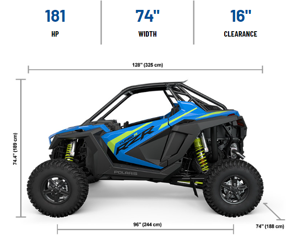 | Other Standard Features | RIDE COMMAND, High Output 900W Charging System, Polaris Pulse System, In- Dash Charge Port, 2 Front DC Accy Ports, Polaris P.A.S.S., Painted Aluminum Roof, Colored Toe Link, Mud and Rock Guards, Color Matched Seats, Front Bumper |