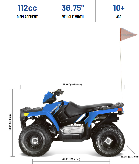 | Other Standard Features | Safety Flag, Parent-Adjustable Speed Limiter, 1 Color Matched Youth Helmet, Training DVD, Safety Tether |