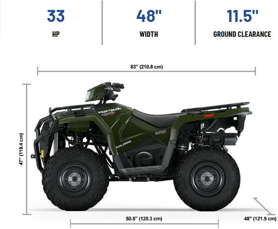 | Overall Vehicle Size (L x W x H) | 83 x 48 x 47 in (210.8 x 121.9 x 119.4 cm) |