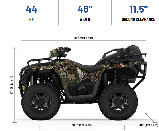 | Other Standard Features | Front and Rear A-Arm Guards, Front Trail Bumper, Rear Trail Bumper, Front Rack Extender, Rear Rack Extender, 2,500 Lb. Polaris HD Winch, Dipped Camo Plastics, Upgraded Wheels & PXT Tires, Kolpin Gun Scabbard & Mount, Kolpin Ratchet Claws, Hand & Thumb Warmers, 12 Volt Power Plug, In Pod Battery Charger |