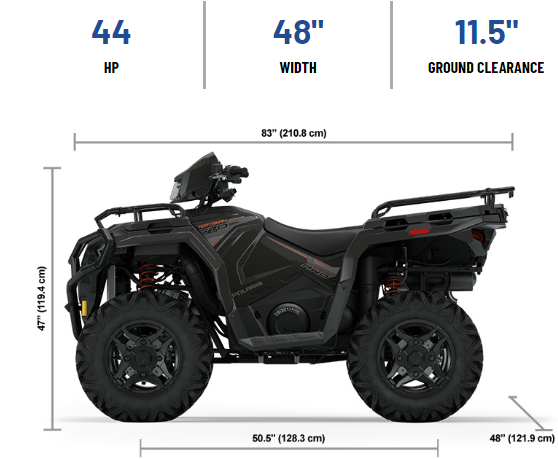 | Other Standard Features | 7" Glove Touch Display, Plow Mode, Group Ride, GPS Navigation, Bluetooth, 3,500 lb. Polaris HD Winch with Auto Stop and Synthetic Rope, Front Trail Bumper, Front and Rear Rack Extenders, Painted Plastics, Painted Springs, In Pod USB Charger, PIN Activated Secrity System (P.A.S.S.), Front and Rear A-Arm Guards, Underseat Storage Bag |