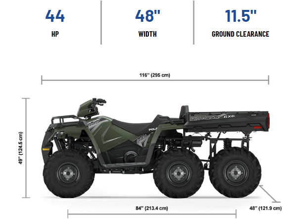 | Overall Vehicle Size (L x W x H) | 116 x 48 x 49 in (295 x 121.9 x 124.5 cm) |