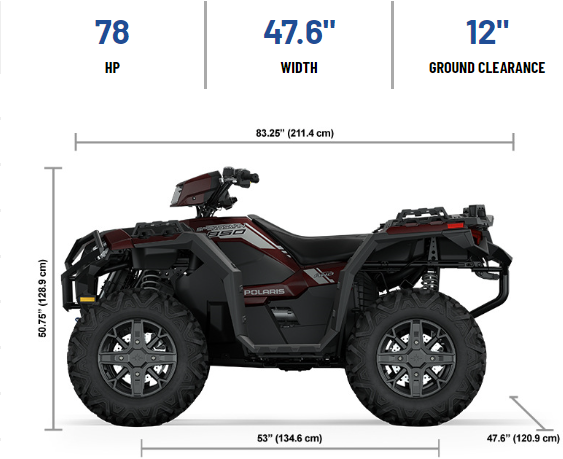 Find specifications below for the 2024 Polaris Sportsman 850 Ultimate Trail Crimson Metallic ATV. Specs include engine, horsepower, transmission/final drive, ground clearance, travel, engine braking system, instrumentation, lighting, suspension, payload capacity, hitch type, cargo system and tires.