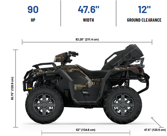 | Other Standard Features | 3,500 lb. Polaris HD Winch with Synthetic Rope, Front Ultimate Series Bumper, Rear Ultimate Series Bumper, Cut and Sew Seat, In Pod Battery Charge Port, Dipped Camo Plastics, PIN Activated Secrity System (P.A.S.S.), Fender Flares, 6 Moveable Tie- Down Points, Hand & Thumb Warmers, Kolpin Ratchet Claws, Kolpin Gun Scabbard & Mount, Upgraded Wheels & PXT Tires |